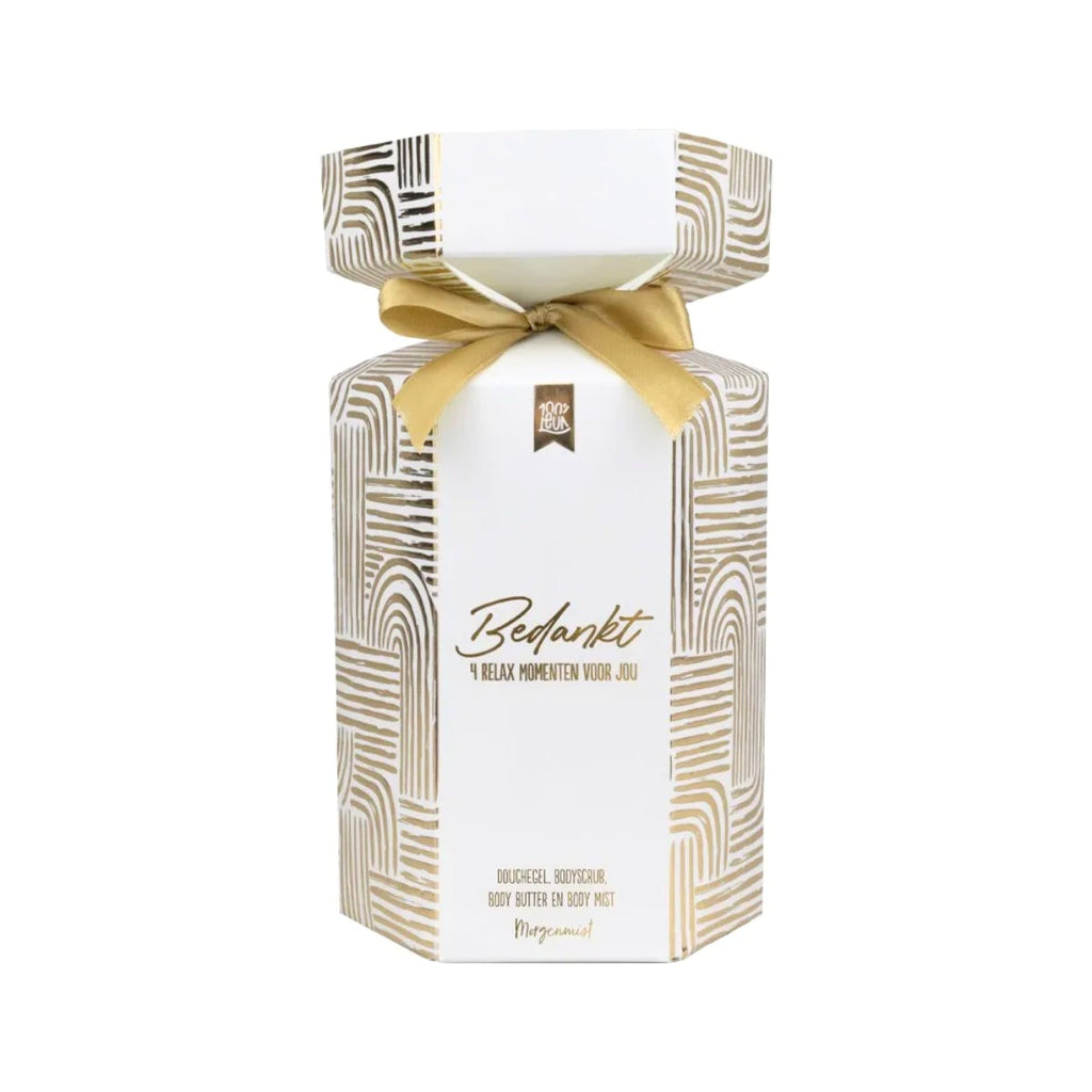 Iemand bedanken voor zijn of haar hulp? Dat kan op zoveel manieren: omdat vrienden hebben geholpen met een verbouwing, of omdat de buurvrouw boodschap- pen deed toen jij griep had. Een bedankje kan natuurlijk ook zakelijk zijn, zoals het team of de afdeling bedanken voor hun inzet. Dit pakket bevat fijne verzorgings- producten, waaronder douchegel, bodyscrub, body mist en body butter, allemaal met de geur Morgenmist. Een frisse en subtiele geur, met een combinatie van bloemige en kruidige tonen die doet denken aan een rustige ochtendwandeling in de natuur.