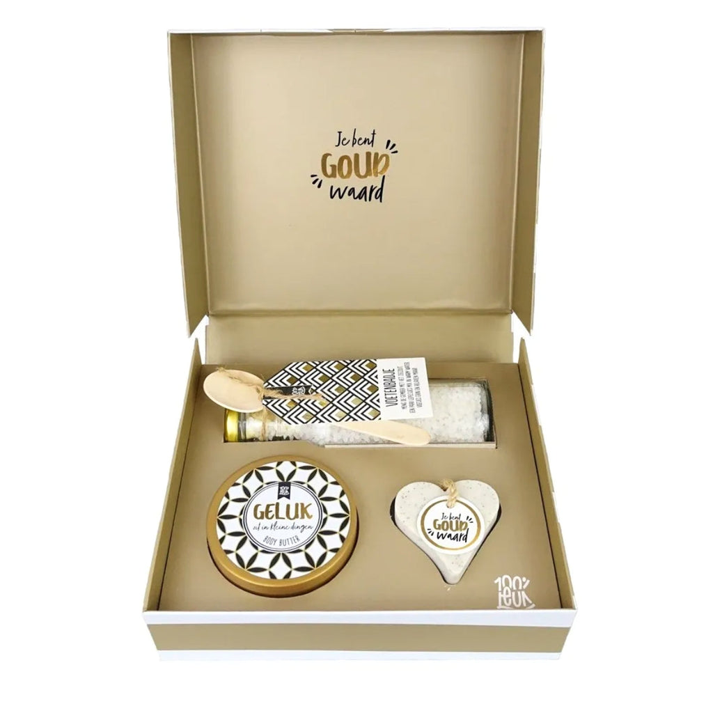Wat geef je iemand die veel voor je betekent? Je wilt je blijk van waardering uitspreken in een waardevolle attentie. Je bent goud waard is het mooist compliment wat je kan krijgen! Dit cadeaupakket zeek geschikt als bedankje, maar ook leuk als compliment, felicitatie of gewoon zomaar als verrassing. Naast de luxe uitstraling zitten de items stevig in het cadeaupakket, zo geschikt om op te sturen zonder te beschadigen.