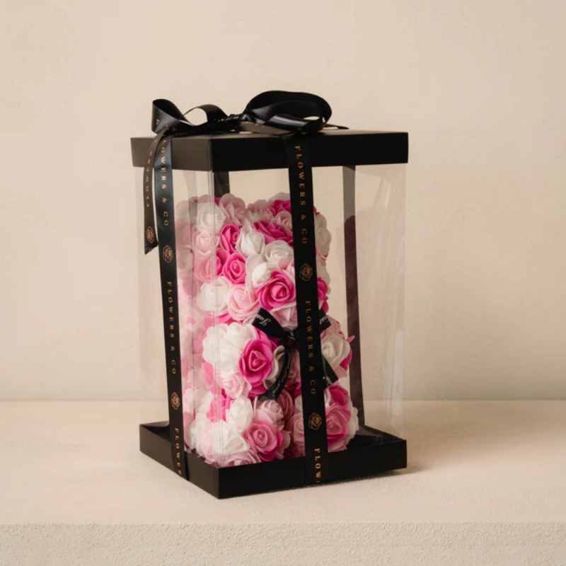 De schattige beer is uitgevoerd in een combinatie van zachte roze en witte tinten en wordt geleverd in een luxe transparante giftbox, afgewerkt met een sierlijke zwarte strik en Flowers & Co-lint. Het perfecte cadeau voor verjaardagen, Valentijnsdag, Moederdag, babyshowers of als lief gebaar ‘zomaar’.