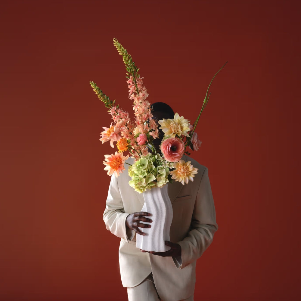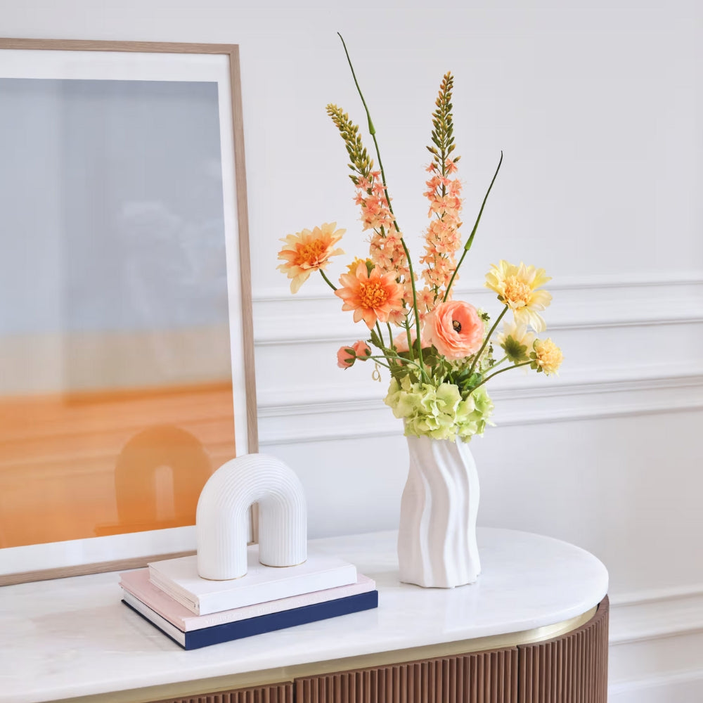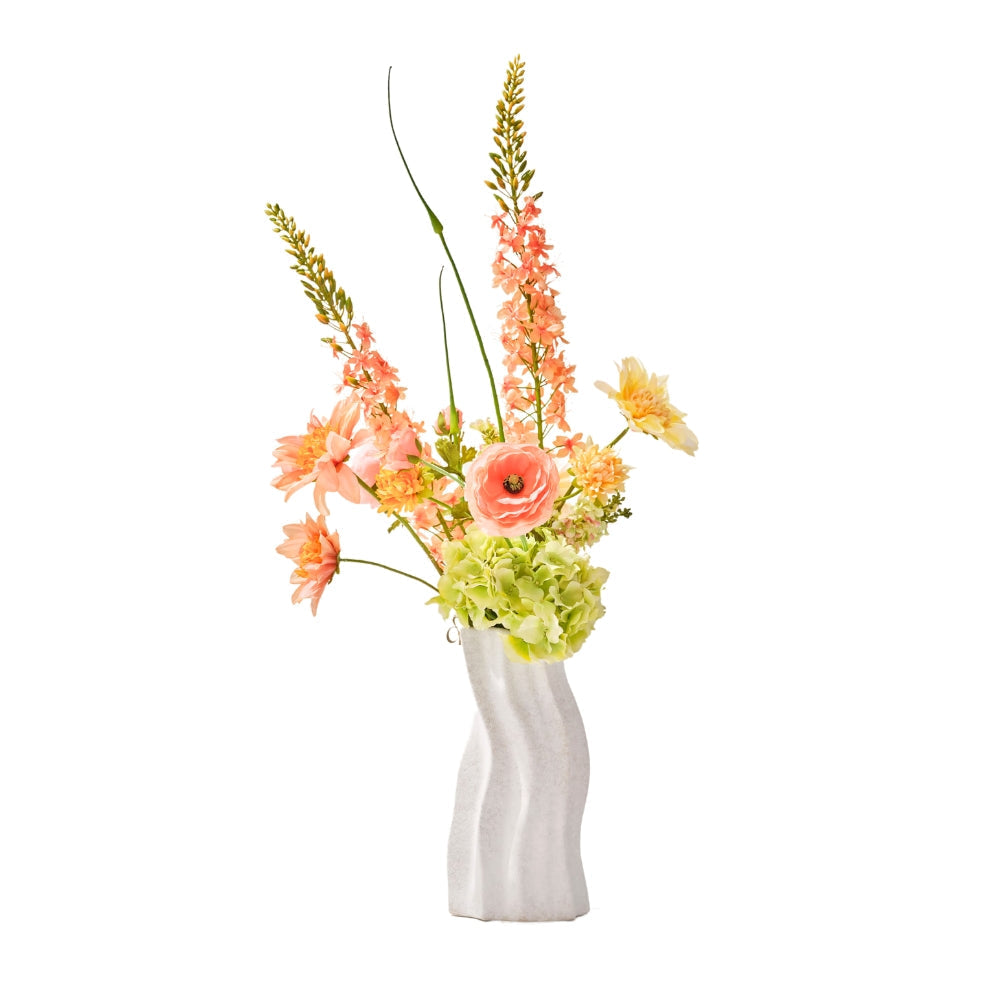 Een levendig ensemble van zijden eremurus, citrus dahlia en groene hortensia in een organische stenen vaas. Dit boeket arriveert met ons gratis bloemparfum.