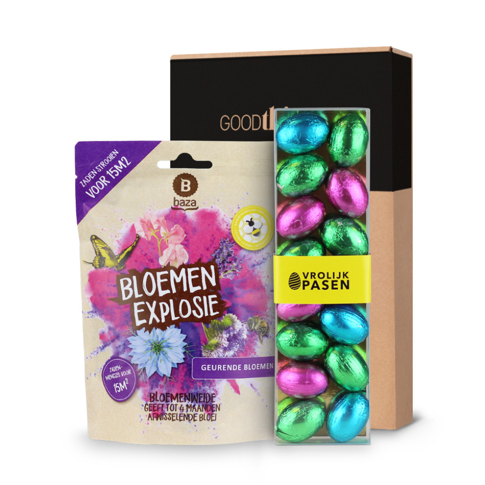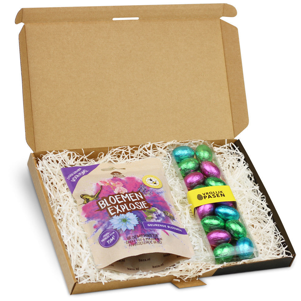 Geef dit vrolijk gekleurde paasgeschenk cadeau en verras je collega's, vrienden of familie! Dit pakket past door de brievenbus en bevat Baza bloemenexplosie geurende bloemen en luxe gekleurde chocolade Paaseitjes. Een leuk en lekker cadeau in één!