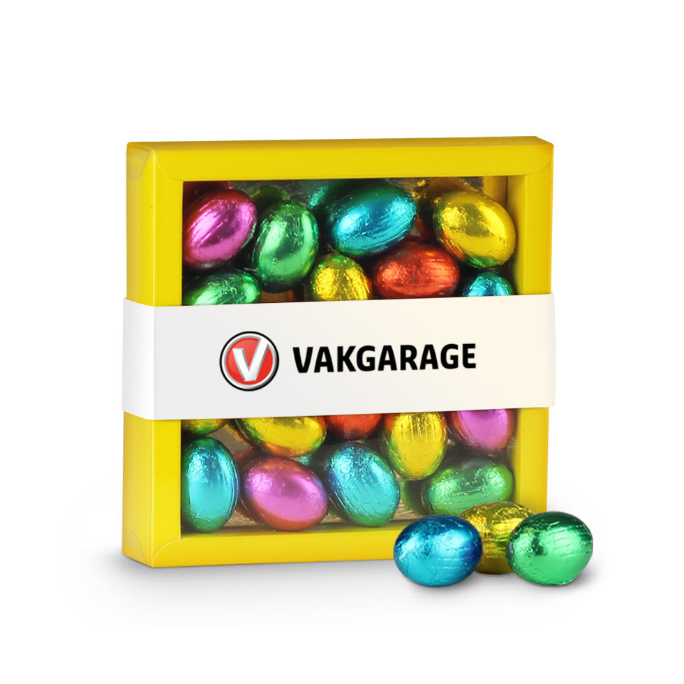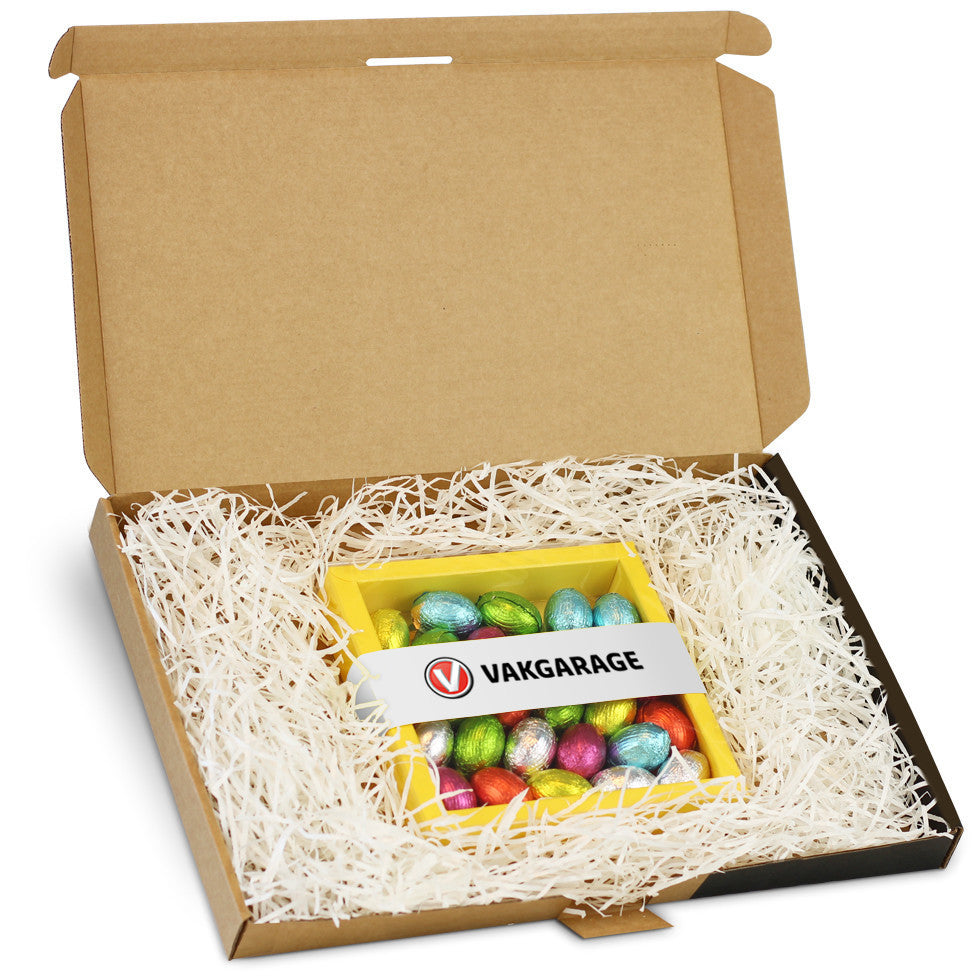 Verras je personeel of collega's tijdens Pasen met een opvallend en uniek paasgeschenk. Bij Pasen denk je natuurlijk direct aan paaseitjes!! Een vrolijk doosje met 220 gram aan luxe paaseitjes, versierd met een op maat gemaakte banderol in jouw huisstijl, is dé manier om te verrassen.