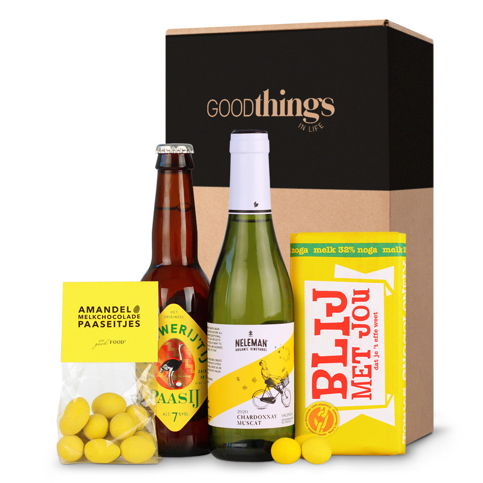 Een echt paasproeverijtje! Zo bevat dit pakket een Brouwerij ‘t IJ PaasIJ biertje dat zacht en licht kruidig van smaak is en een licht, fris en fruitige Chardonnay wijn van Neleman. We maken jouw paasborrel compleet met een Tony's Chocolonely reep met de smaken melk & noga en een zakje originele amandel paaseitjes.