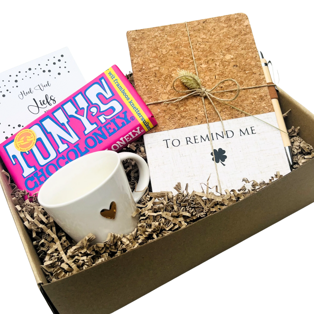 Wil jij iemand laten weten dat je aan ze denkt of een hart onder de riem steken? Of ken je iemand die wel wat liefde en ontspanning kan gebruiken? Dan is dit het perfecte cadeau! Deze giftbox biedt een moment van rust en persoonlijke aandacht. Het notitieboekje nodigt uit om je gedachten van je af te schrijven, terwijl je lekker met een mok en chocolade op de bank kunt zitten en genieten van wat rust.