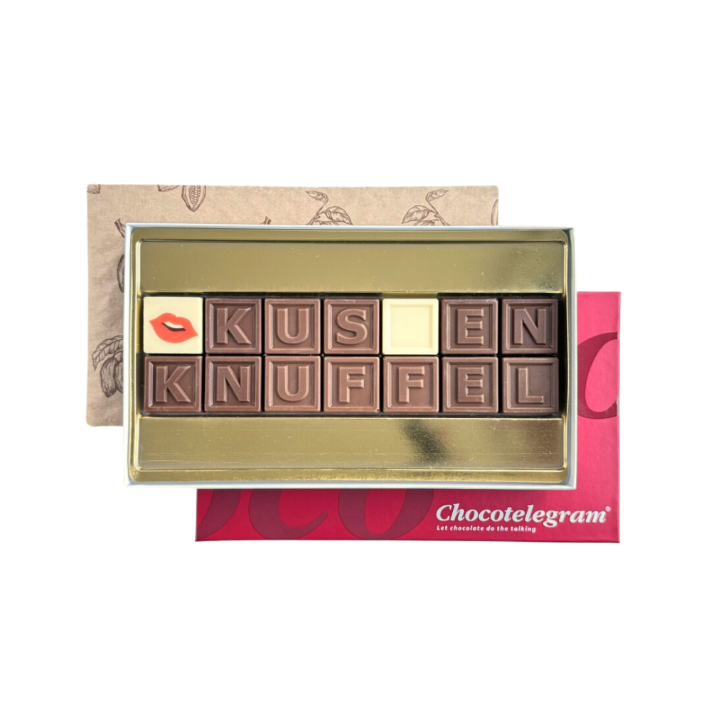 Geef een liefdevolle boodschap met chocolade. Dit Chocotelegram bestaat uit 14 chocoladeletters die samen de tekst "KUS EN KNUFFEL" vormen. Gemaakt van een heerlijke mix van melk- en witte chocolade, perfect om iemand te verrassen of te laten weten dat je aan ze denkt.