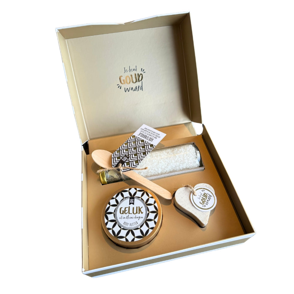 In het goud waard pakket vind je het populairste cadeau uit de collectie, namelijk het voetenbadje. In de relax door de ingrediënten uit het voetenbadje te mixen en in een teiltje te scheppen. Voeten erin en ontspannen maar! Je komt eruit met zachte voeten. De bodybutter is zacht en verzorgend en heeft een heerlijk frisse geur van sheabutter. Het zeephart is te gebruiken als handzeep, maar zou dat stiekem niet zonde zijn? De hartzeep schittert namelijk in iedere ruimte terwijl het een frisse geur verspreid.