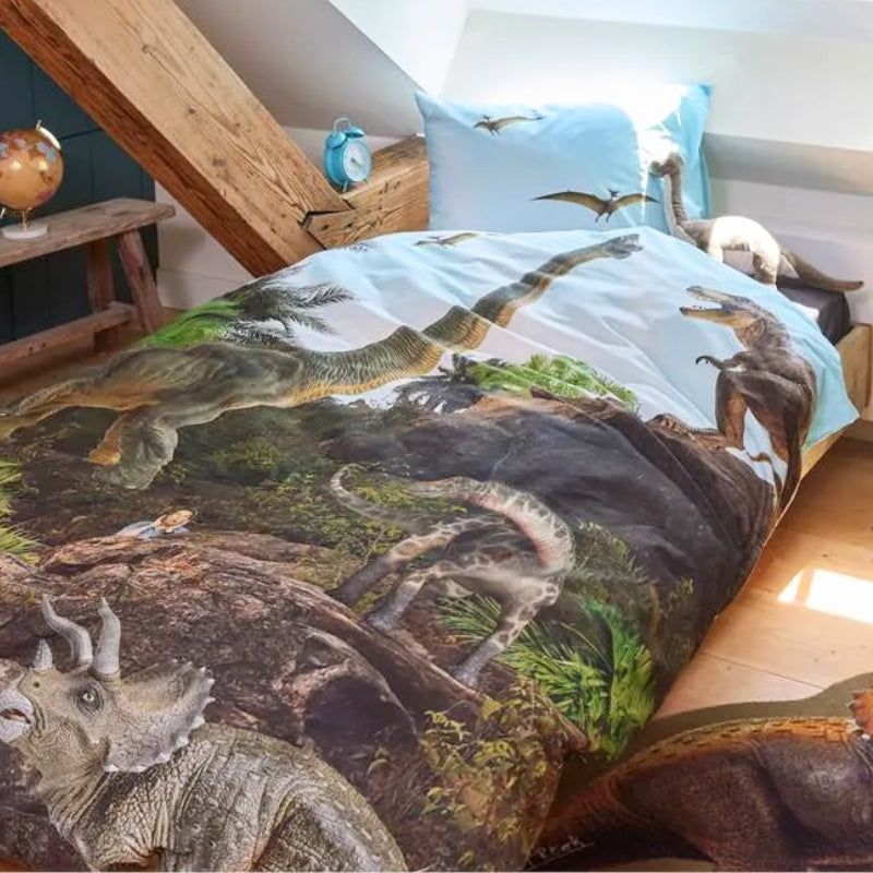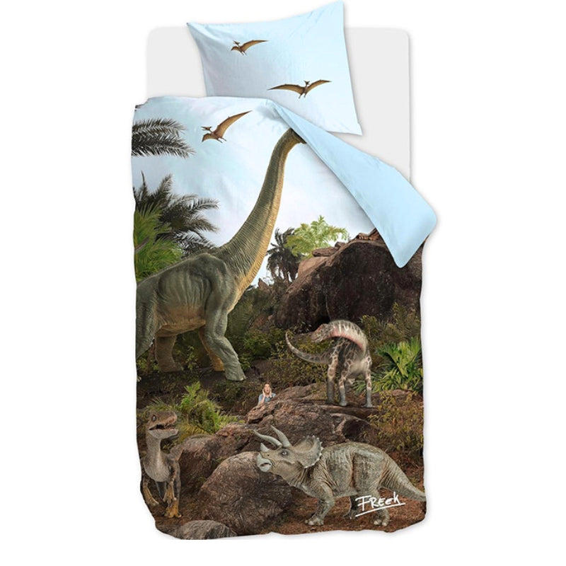 | Dino''s zijn natuurlijk al lang uitgeslapen, ehh, uitgestorven! Maar op het dekbedovertrek Dappere Dino''s zijn ze nog volop in leven, cool! Spot jij nog een andere dino naast een triceratops en een brachiosaurus? De achterkant van het overtrekt komt in een effen lichtblauwe kleur.