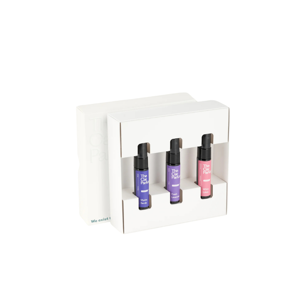Deze prachtige cadeauset bevat een selectie van drie unieke geurvarianten in stijlvolle 15ml flacons: Mystic Sands, Fresh Lavender, en White Lotus. Elke geur biedt een bijzondere beleving die je autorit verrijkt en een frisse atmosfeer creëert.