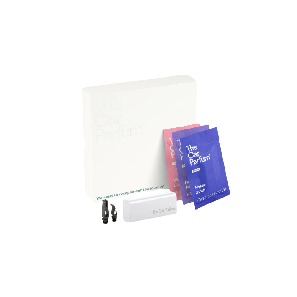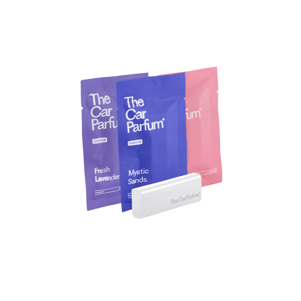 Deze set bevat één CarBar houder, beschikbaar in zwart of off white, en één navulling van elk van onze sprankelende geuren: Mystic Sands, Fresh Lavender, en White Lotus. Creëer een verkwikkende en veelzijdige geurbeleving die elke autorit verrijkt.