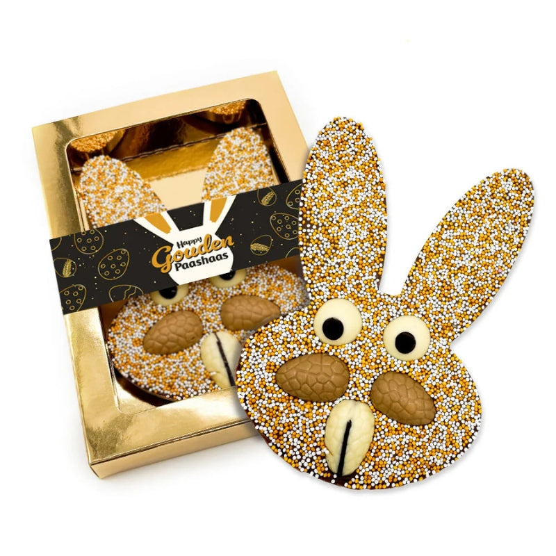 Een melkchocoladetablet in de vorm van een paashaas met crunchy ballen en ‘discodip’ sprinkles. Dit product zit in een luxe papieren gouden doos. Daaromheen zit een papieren sleeve met de tekst "Happy Gouden Paashaas".